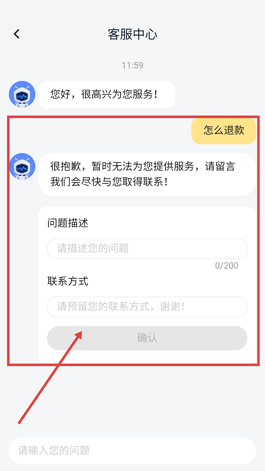 4、在问题输入页面,输入问题后若需留言,可填写问题描述和联系方式,提交后等待客服回复哦。