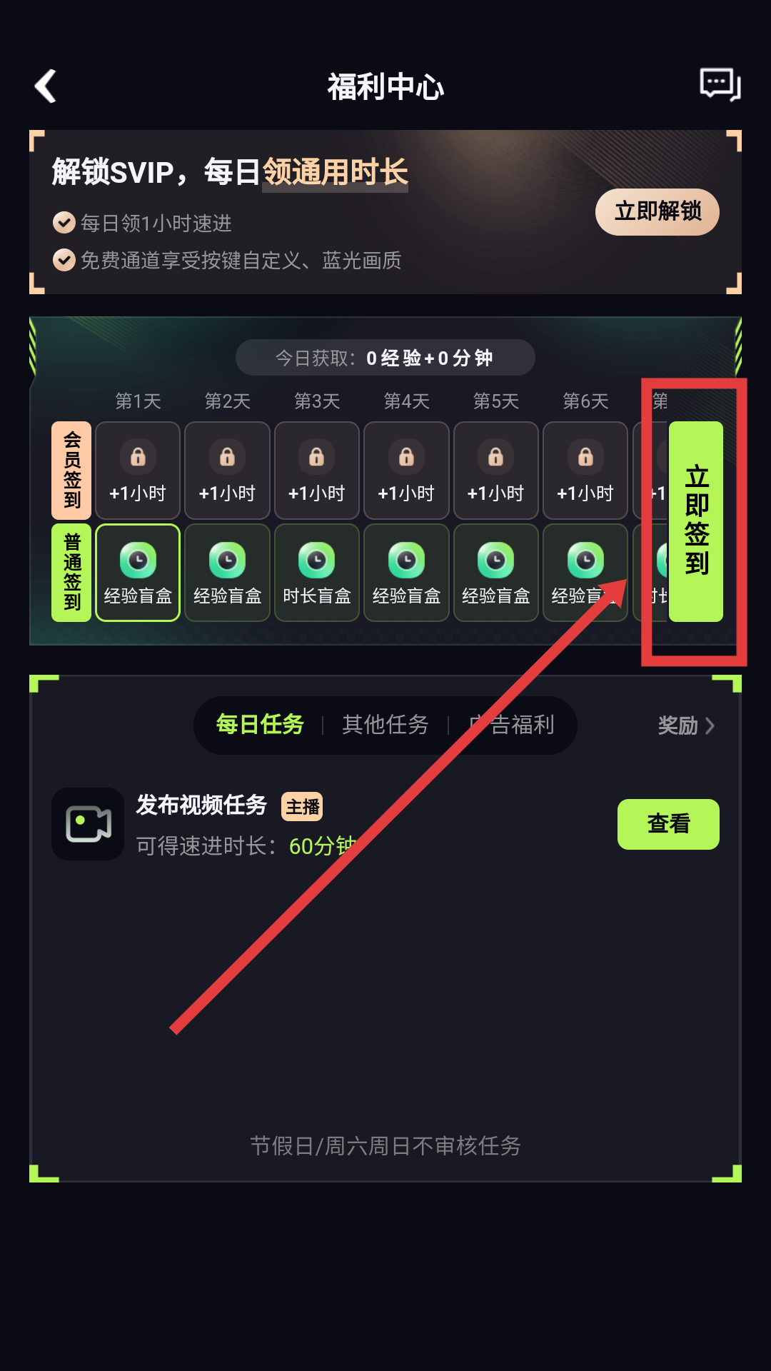 2、在福利中心点击【立即签到】,弹出签到领经验值的选择框啦。