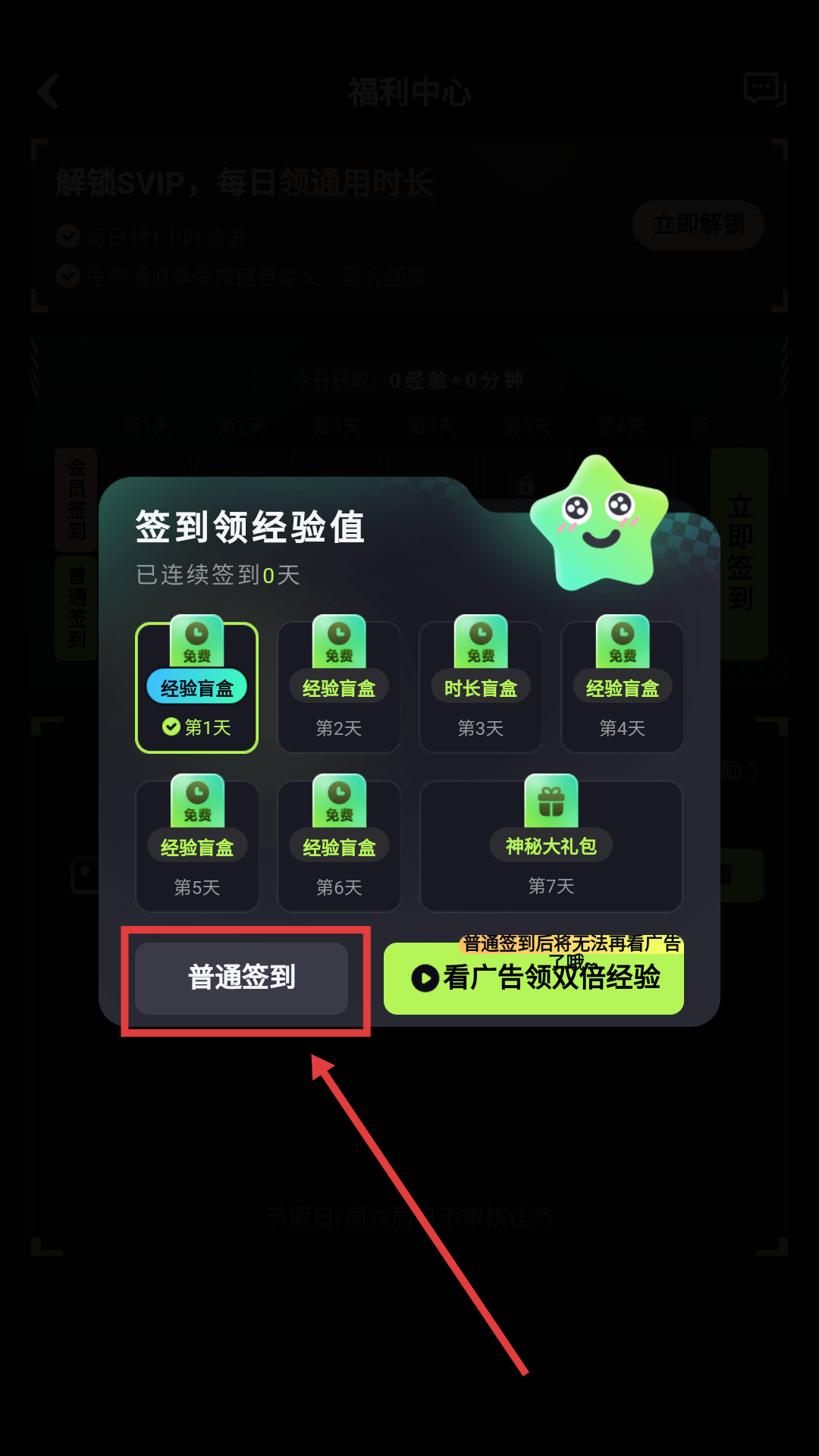 3、在选择框点击【普通签到】,即可领取当日签到奖励,积累经验值哦。