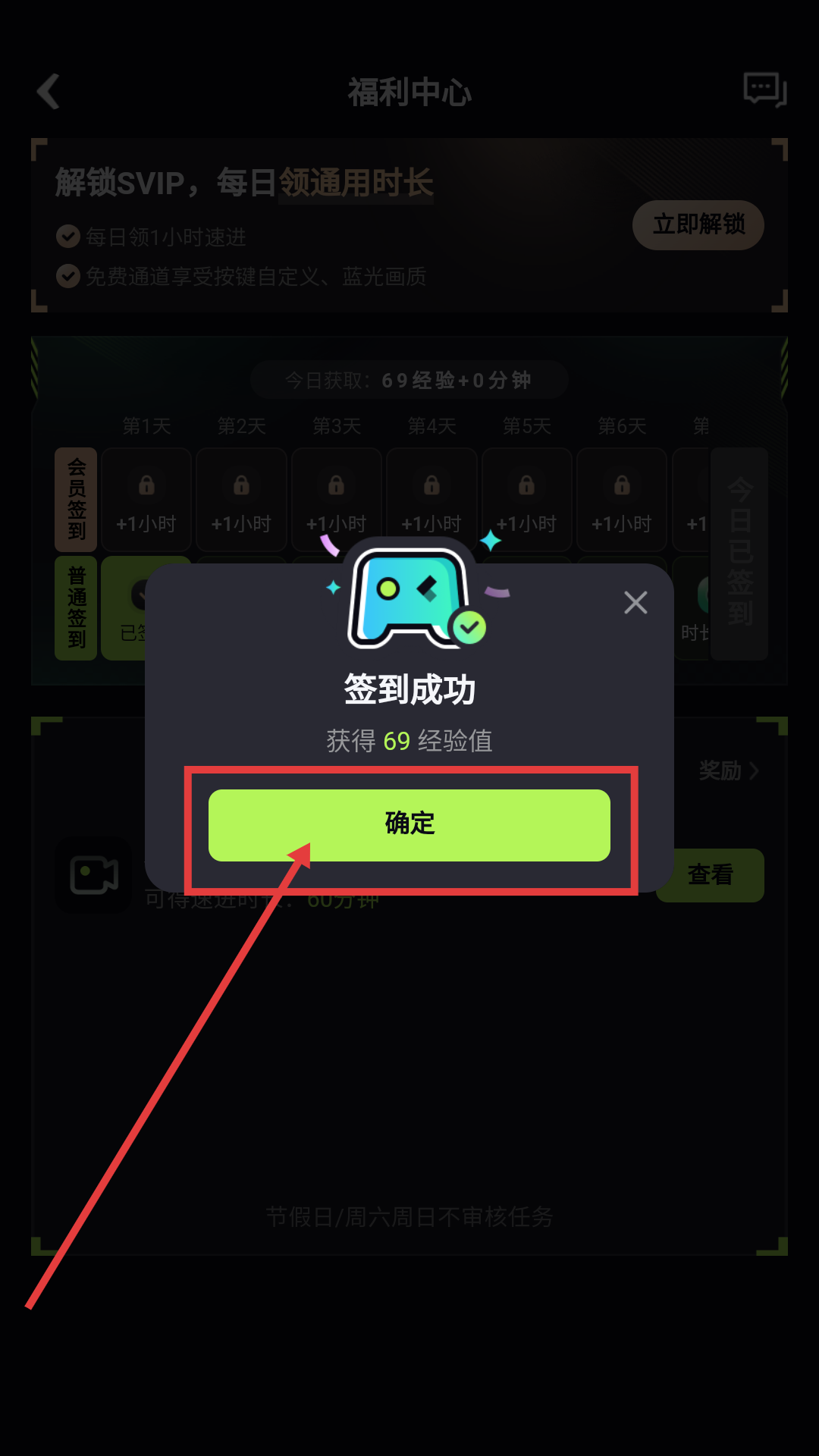 4、签到成功后点击【确定】,完成签到流程,继续享受游戏福利啦。