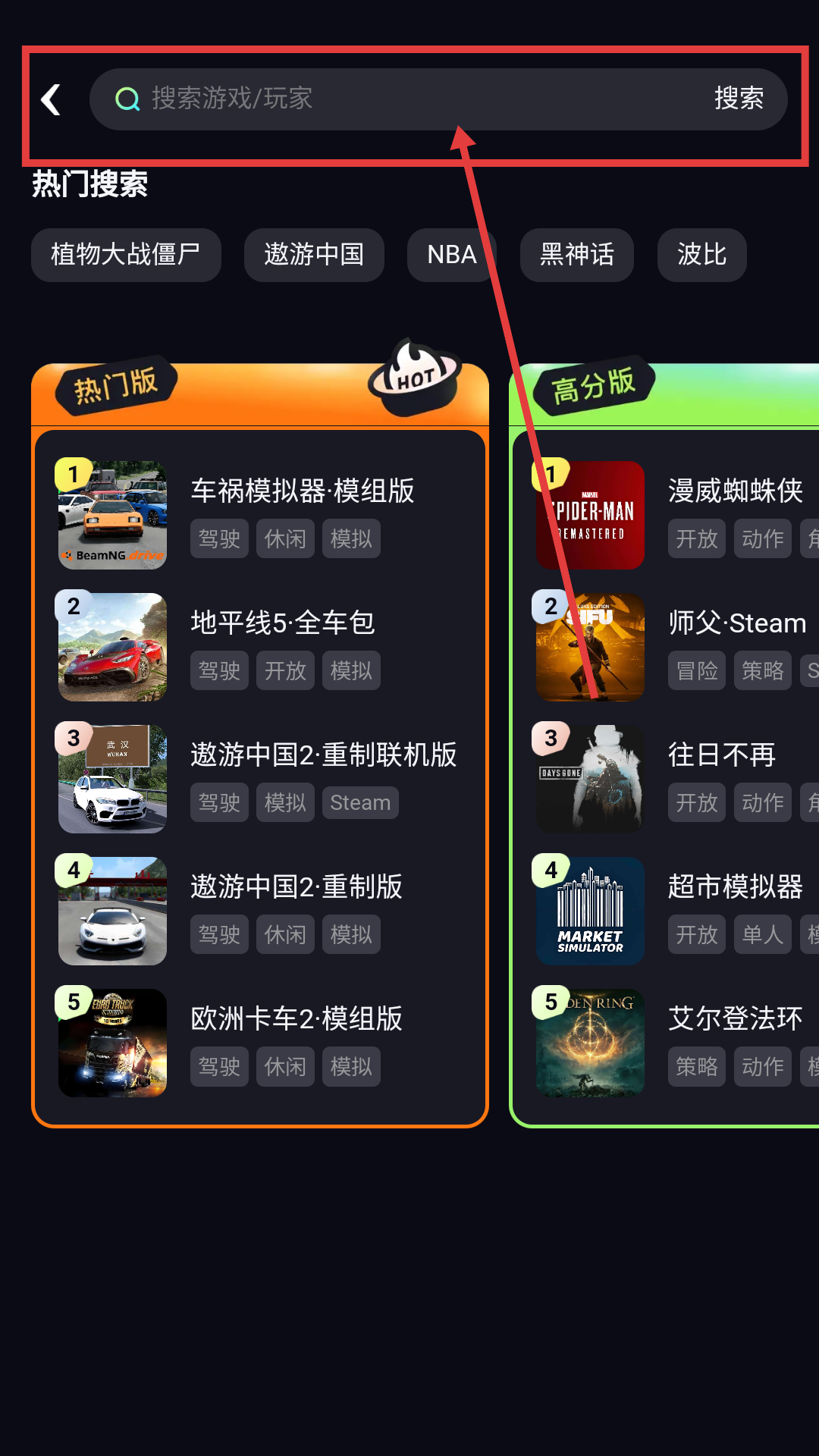 1、在APP页面,点击右上角【搜索】,可进入搜索页面,准备查找想玩的游戏啦。