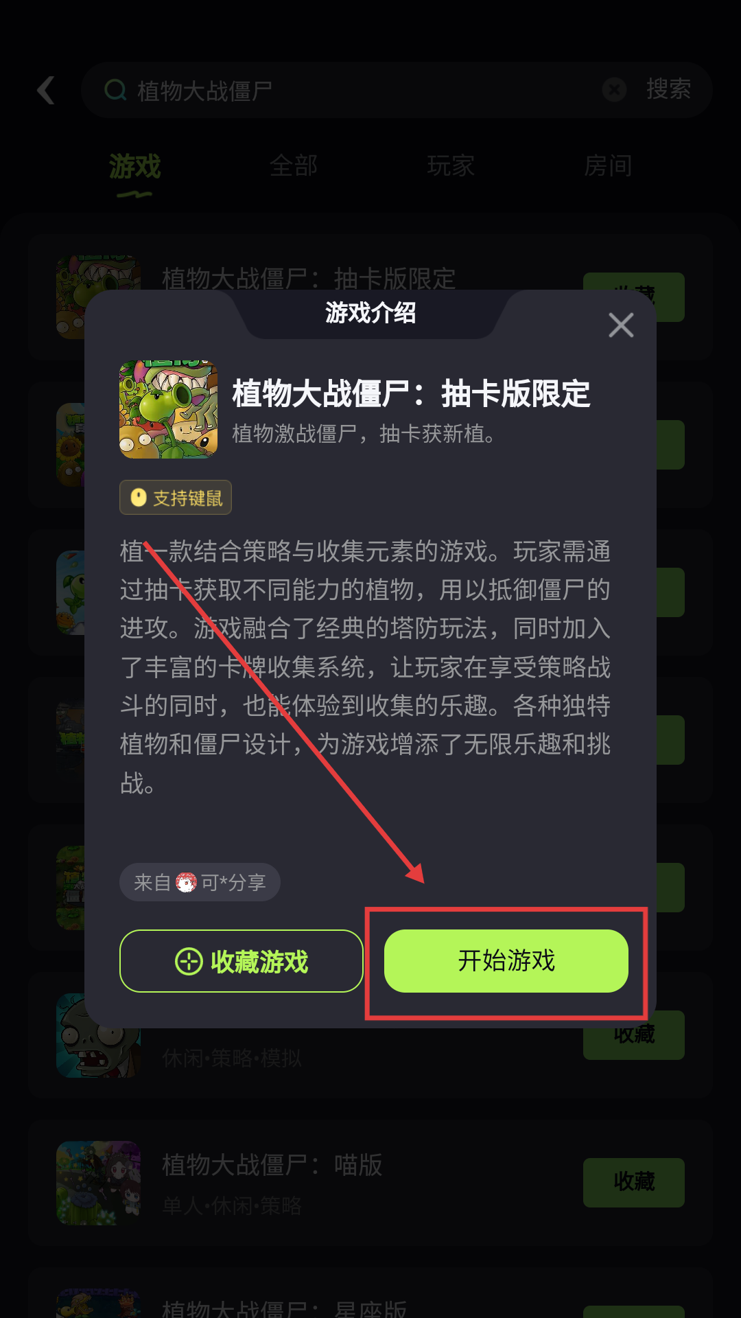 4、进入游戏详情页面后,点击【开始游戏】,即可开启《植物大战僵尸:抽卡版限定》的游戏之旅哦。