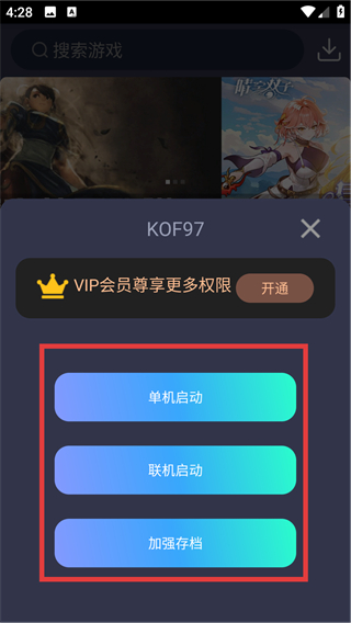 1、在首页找到想玩的游戏,像【KOF97】,点它旁边的【获得】按钮,就能进入游戏的启动选项页啦。