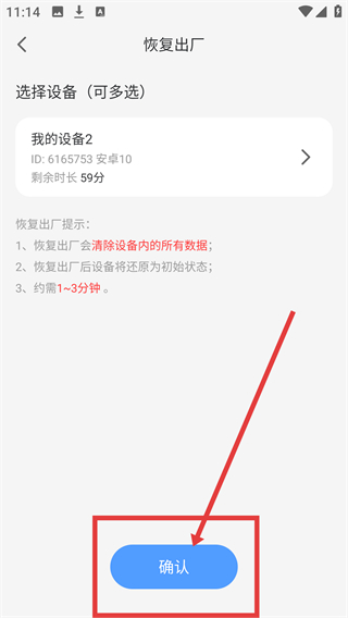 3、进入恢复出厂页面后,确认待操作的设备,阅读提示后点击【确认】,即可触发二次确认弹窗啦。