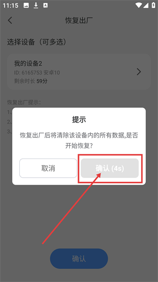 4、在二次确认弹窗中,等待倒计时结束后点击【确认】,设备就会开始恢复出厂设置,清除所有数据啦。