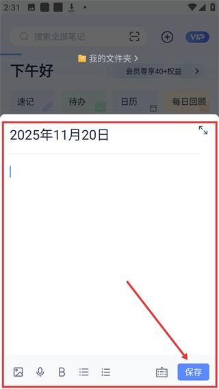 2、在新建笔记页输入内容后,点击右下角【保存】,即可将这条笔记存储到列表中啦。