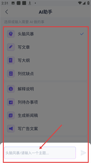 4、在助手界面选好功能后,在输入框填写主题,即可生成对应内容啦。