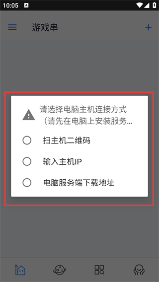 2、【游戏串】界面弹出连接方式弹窗,红框内有【扫主机二维码】等选项,需先安装电脑服务端再选择连接方式。