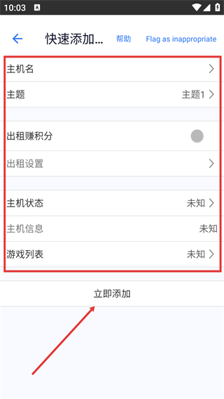 4、完善【快速添加】界面的【出租设置】【游戏列表】等未知信息,确认无误后点击【立即添加】完成主机添加。