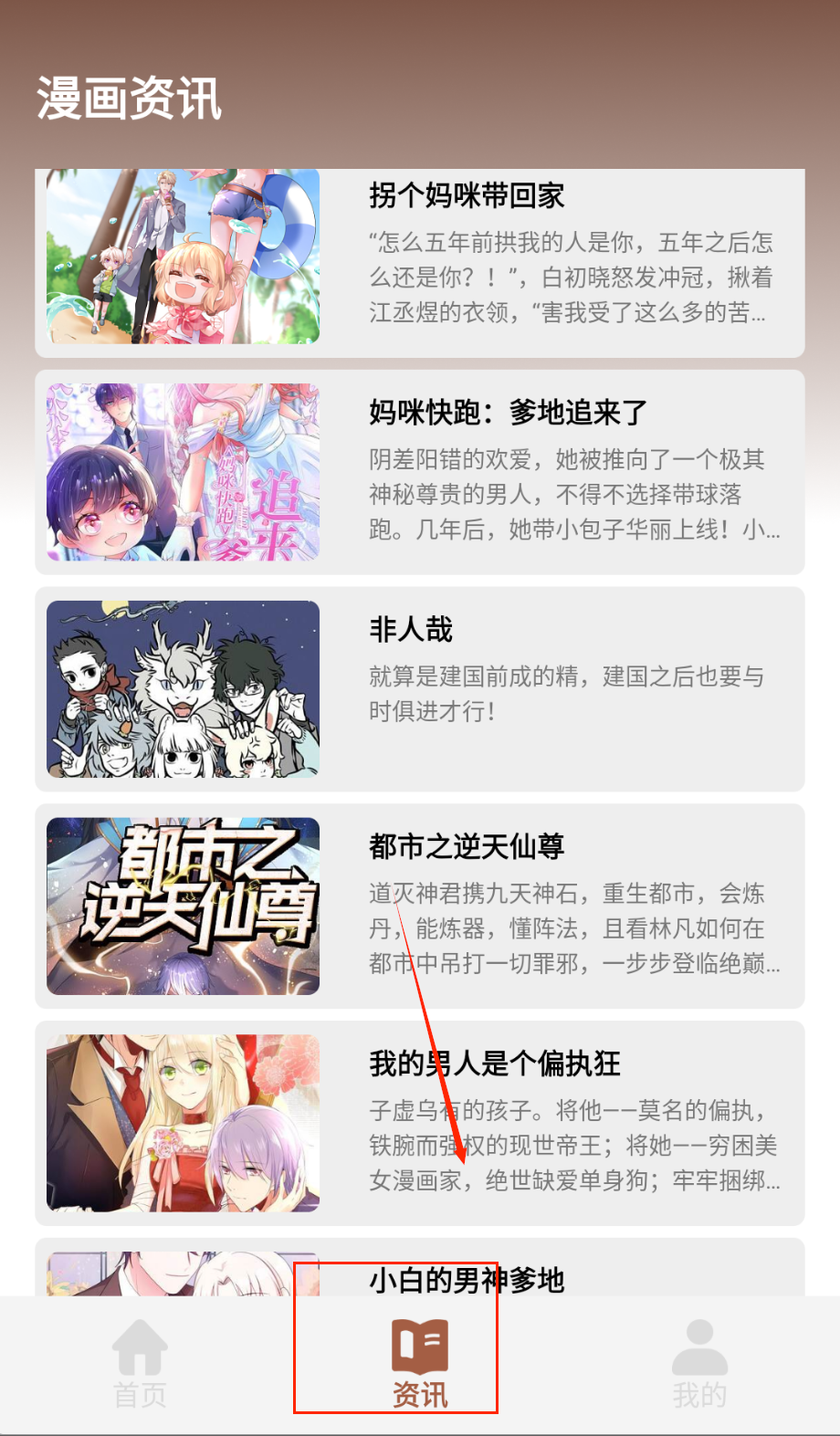 1、资讯页面会展示多部漫画的封面和简介,像《狼性老公玩刺激》这样的作品会有精彩片段预览,滑动页面可以浏览不同作品。
