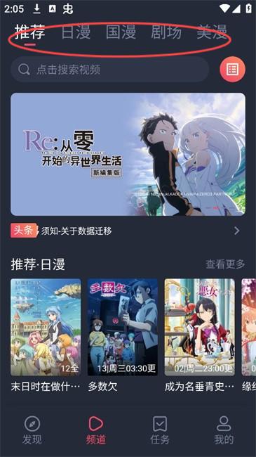 2、接着点击下方的“频道”,包含了日漫,国漫,美漫等内容。