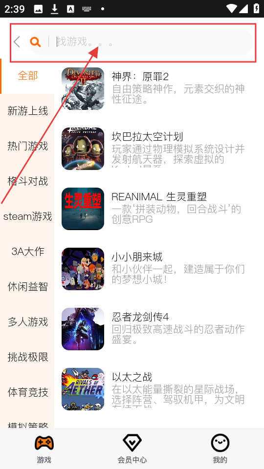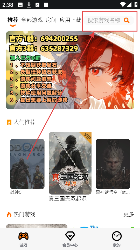 1、游戏页点搜索框,进入搜索页面,可搜索想玩的游戏哦。