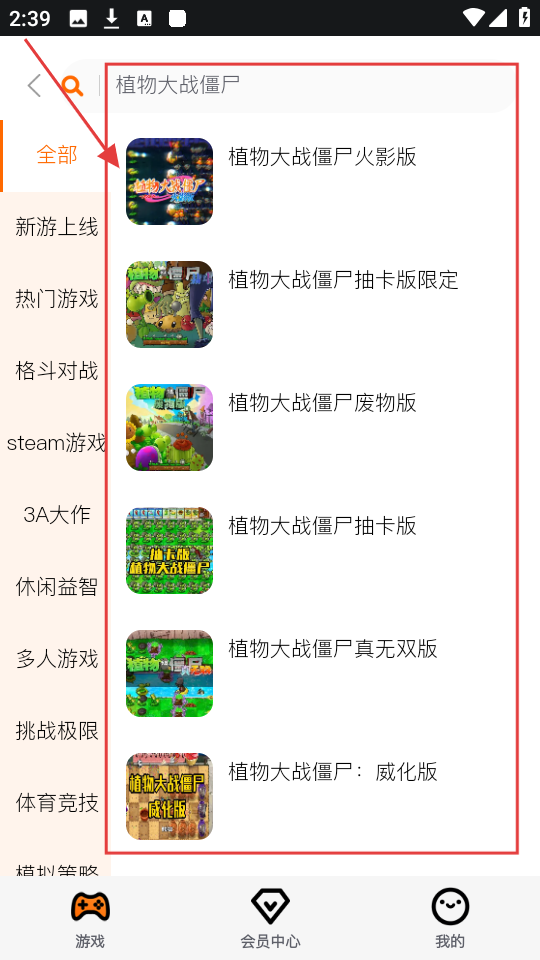 3、搜索结果页选《植物大战僵尸火影版》,进入游戏详情页,超简单呢。