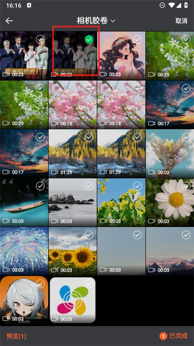 2、点击进入滤镜功能后可以看到手机中的所有视频,选择自己想要更换滤镜的视频;