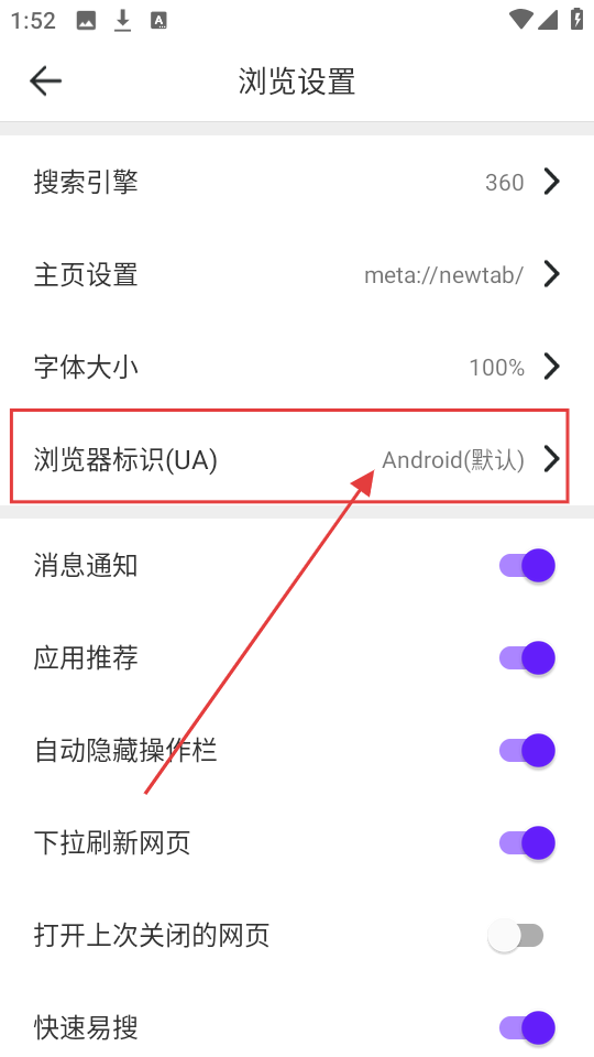 3、在浏览设置页面,点击【浏览器标识(UA)】,可进入浏览器标识设置页面啦。