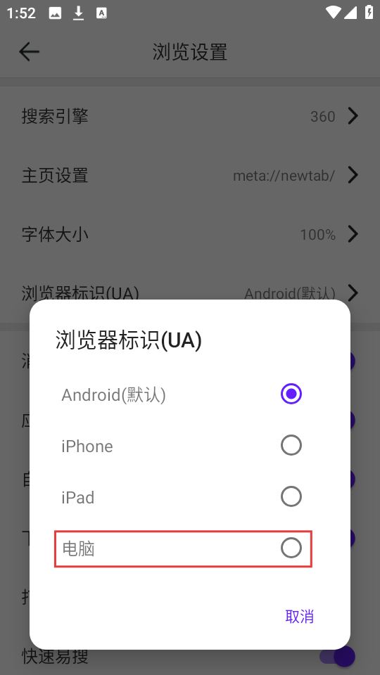 4、在浏览器标识设置页面,可选择电脑标识,选择后即可应用新标识哦。