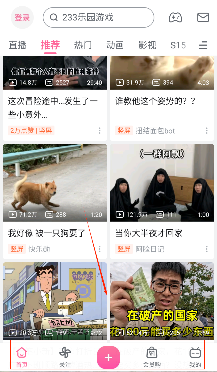 2、在首页推荐页面可以浏览各种类型的视频内容,包括动画、影视、游戏等分类,每个视频卡片会显示标题、播放量和点赞数。