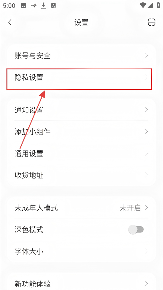 2、进入设置界面后,找到【隐私设置】选项并点击,就能进入隐私设置页面啦。