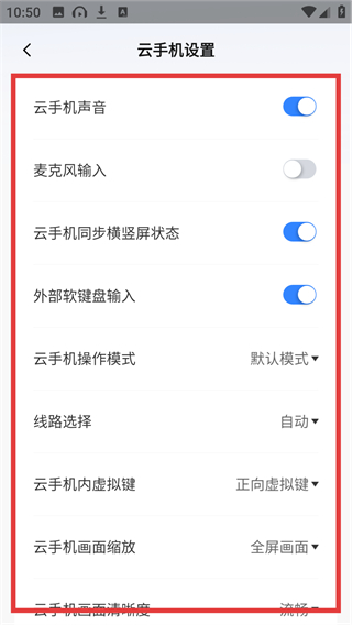 3、在云手机设置页能看到多个功能开关和选项,可根据需求调整云手机的声音、操作模式等配置呢。