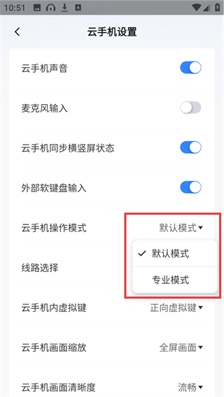 4、点击【云手机操作模式】的下拉选项,就能切换【默认模式】或【专业模式】,适配不同的操作习惯哦。