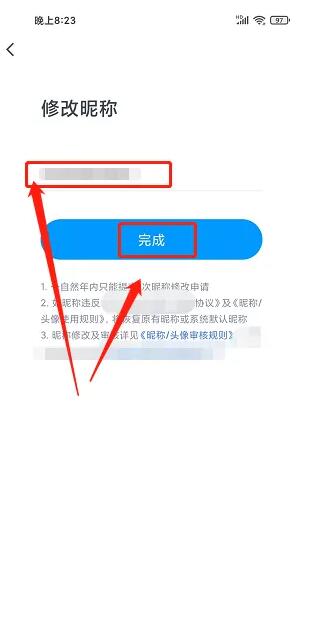 4、进入修改昵称界面,输入昵称,点击【完成】。