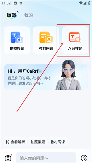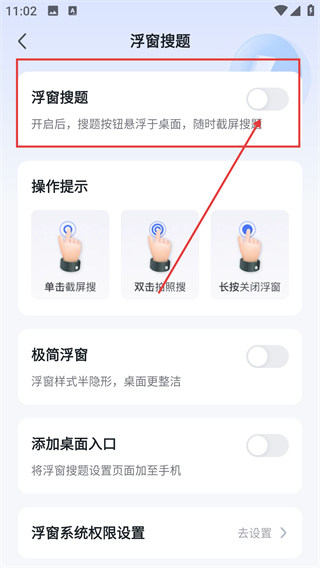 1、在搜题首页点【浮窗搜题】选项,能进入浮窗设置界面,后续可开启浮窗功能方便搜题啦。