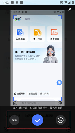4、进入截屏界面后,框选要搜的题目区域,点确认按钮就能提交题目进行搜索啦。