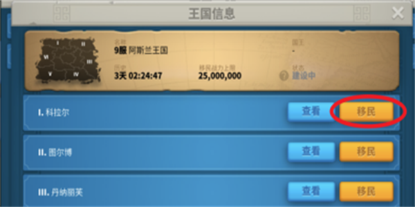 3、这里可以看到所有的王国,选择需要移民过去的王国。