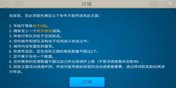 5、确定好想要移民过去的王国后查看是否满足移民条件,全部满足后花费移民令就可以成功移民了。