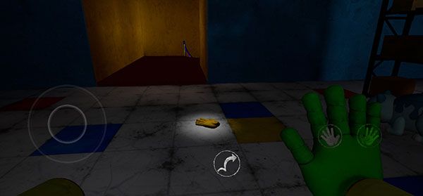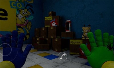 3、醒来出现在一个陌生的世界,这里有很多玩具,左下角按钮可以操纵角色自由移动,右侧代表左右手掌,便于拾取物品,目前只能使用绿色手掌。