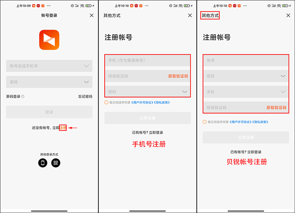 如果您还没有注册帐号,你可以点击主界面正下方的“注册帐号”,注册方式有手机号注册、贝锐帐号注册两种。您还需要同意贝锐用户许可协议及隐私政策后,根据界面要求输入所需信息,注册帐号后登录。
