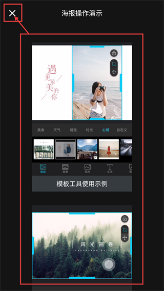 2、进入后会显示【海报操作演示】,可查看模板工具的使用示例,了解后点击左上角叉号关闭演示哦。