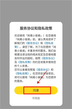 1、点击网易小蜜蜂app,进入之后你就会看见到服务协议和隐私政策,点击“同意”。