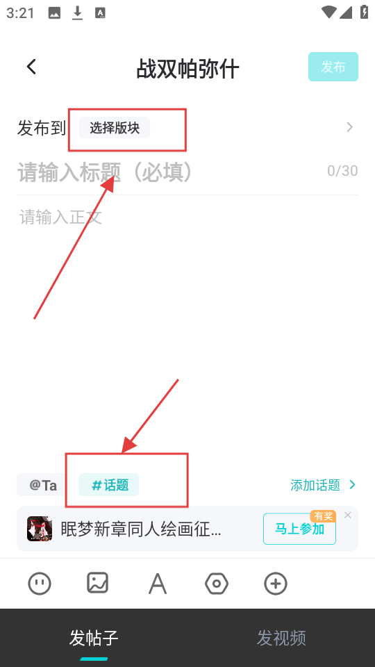 2、发帖页选版块、填标题,还可加话题,超丰富呢。