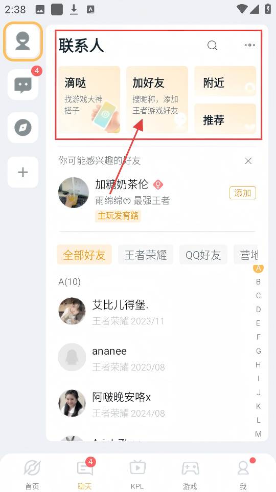 2、到聊天页面,能看到【滴哒】【加好友】等选项,点击【加好友】,就可以添加游戏好友,超棒的。