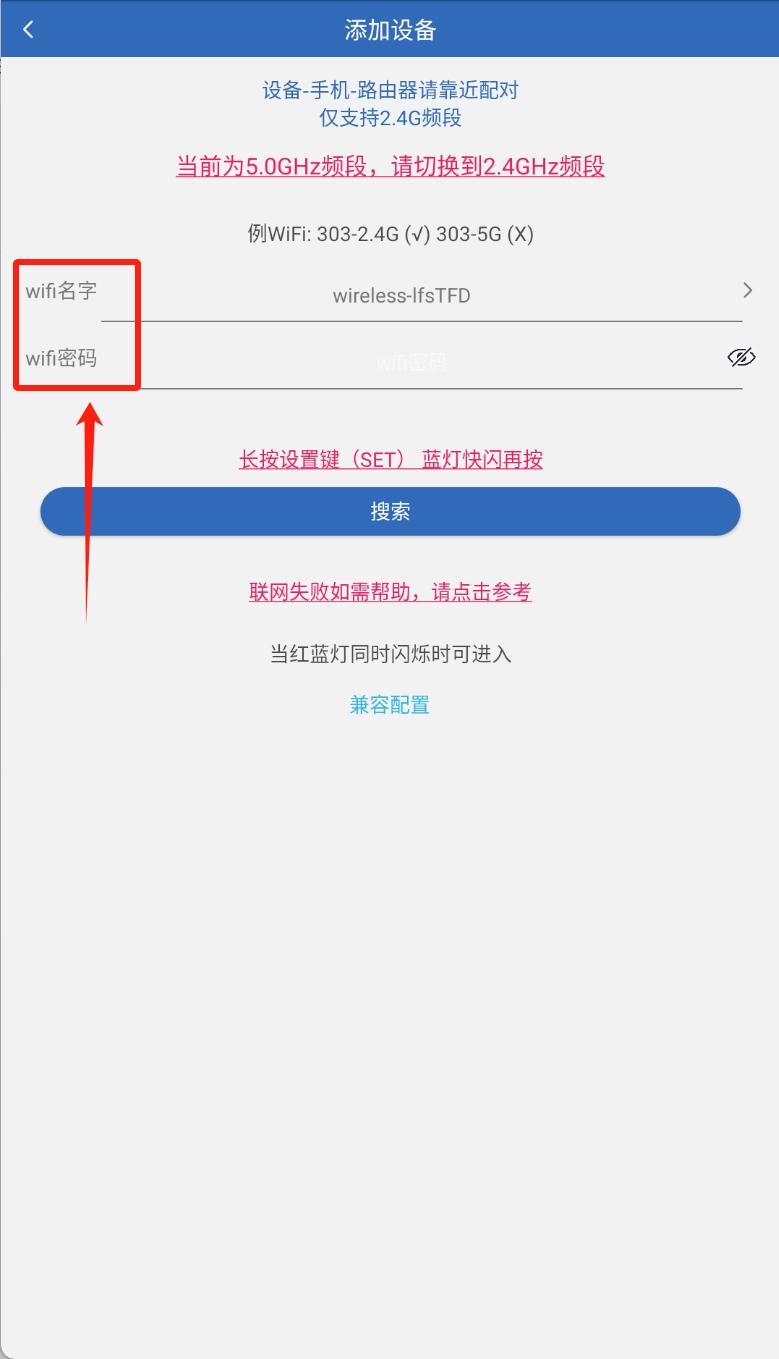 3、根据自己的需求可以进行选择,这里我用wifi举例,输入自己的wifi名称和密码后点击搜索便能够进行使用了。