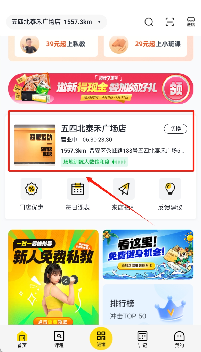 1、场馆预约模块,查看附近合作健身房列表,筛选符合需求的训练场所。预约心仪时间段课程,管理个人预约记录。