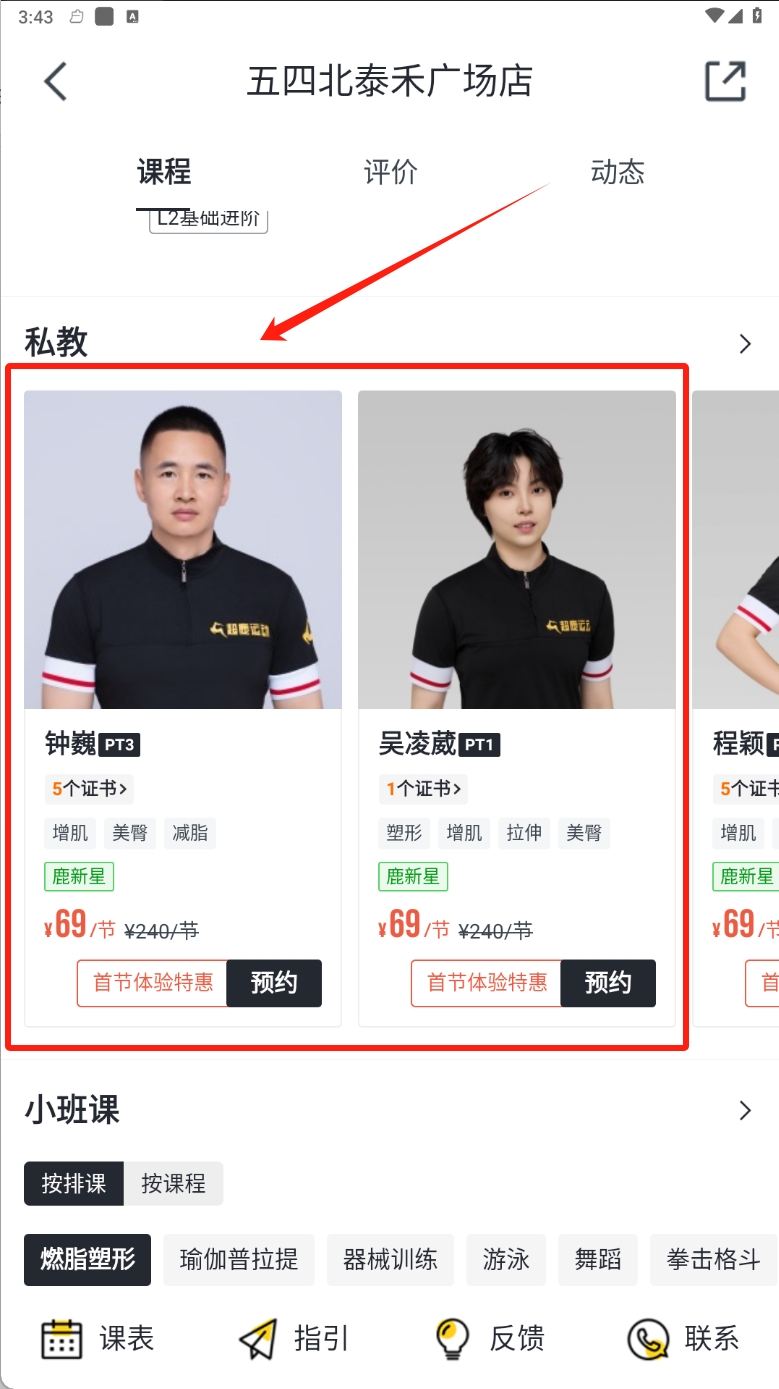 2、接着进入到健身房的详情界面,在该界面选择一位私教教练。