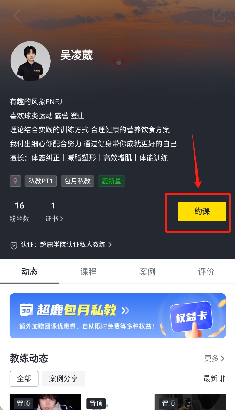 3、最后进入到私教教练的介绍界面,在该界面点击约课选项即可进行预约了。