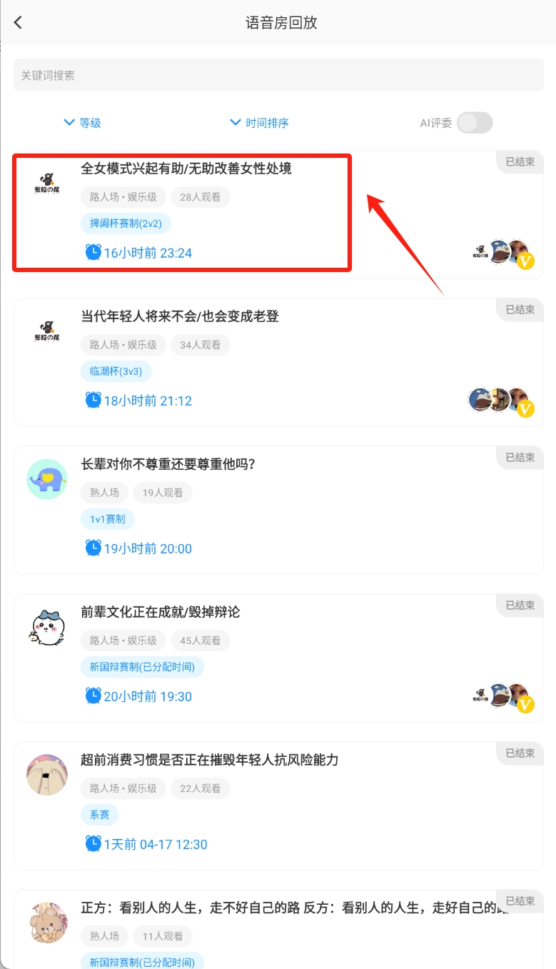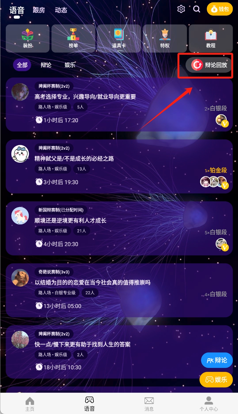 2、选择语音房点击进入即可观看回放。