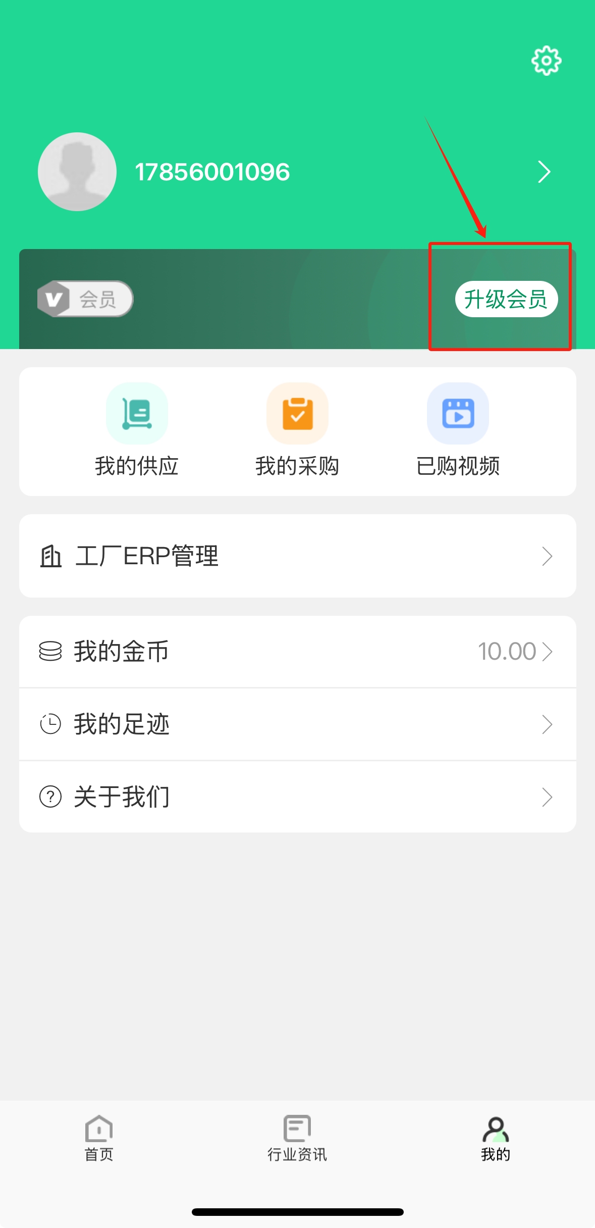 1、首先用户打开手机上的旧衣天下通,进入我的页面中点击升级会员,开通内贸通会员。
