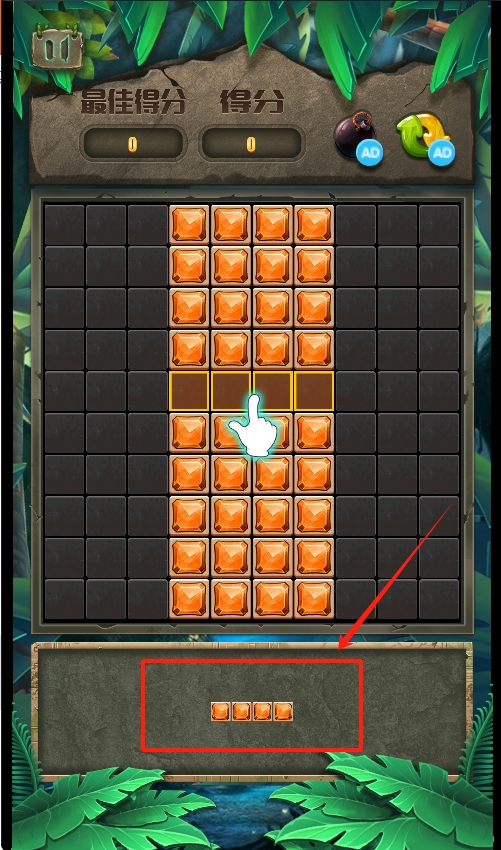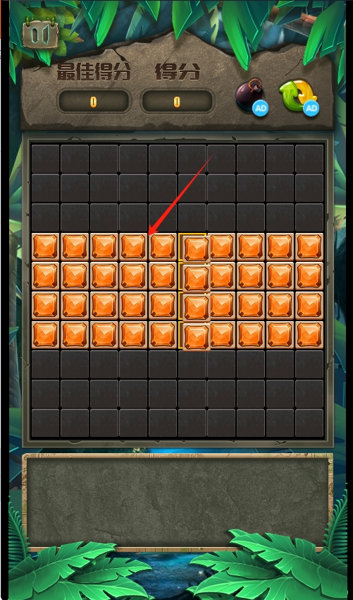 2、控制方块下落:通过操作控制方块的下落位置,合理摆放方块,填满一行即可消除。
