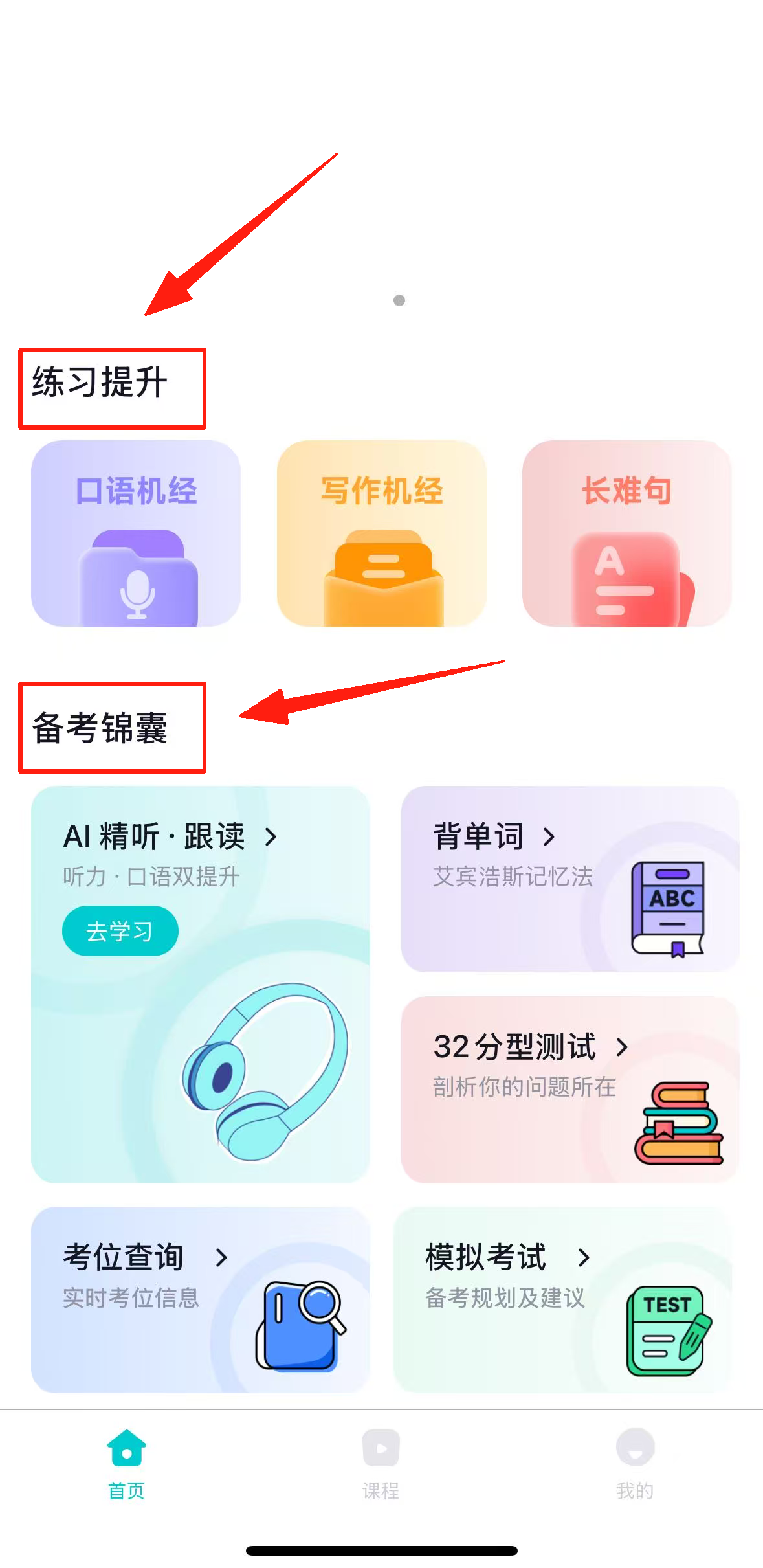 3、首页有听力、口语、阅读、写作等多种练习方式。