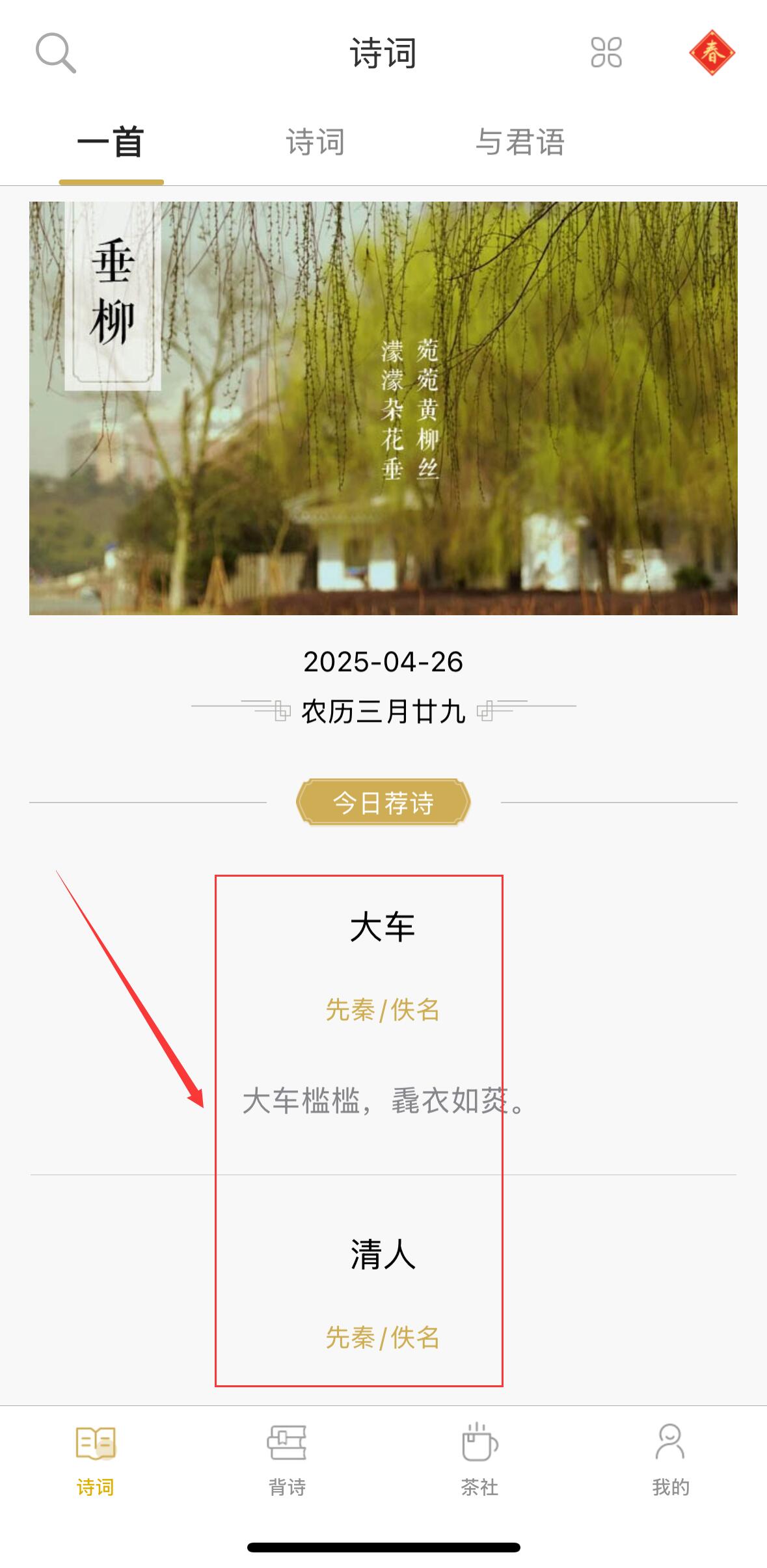 1、在首页滑动就能看到每日推荐的节气诗词。