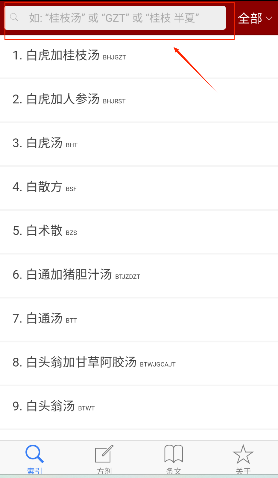 1、运行小猴掌上伤寒论APP后无需注册登录,你可以直接先在索引中查询方剂。支持拼音首字母搜索,比如搜索“桂枝汤”可以搜索“GZT”或“桂枝半夏”。