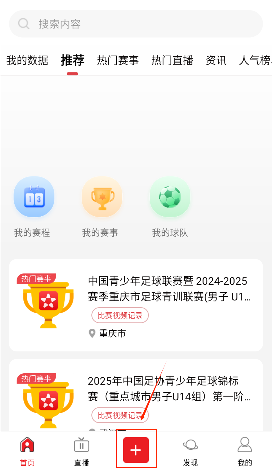 1、进入我是球星app之后点击底部的+号按钮。