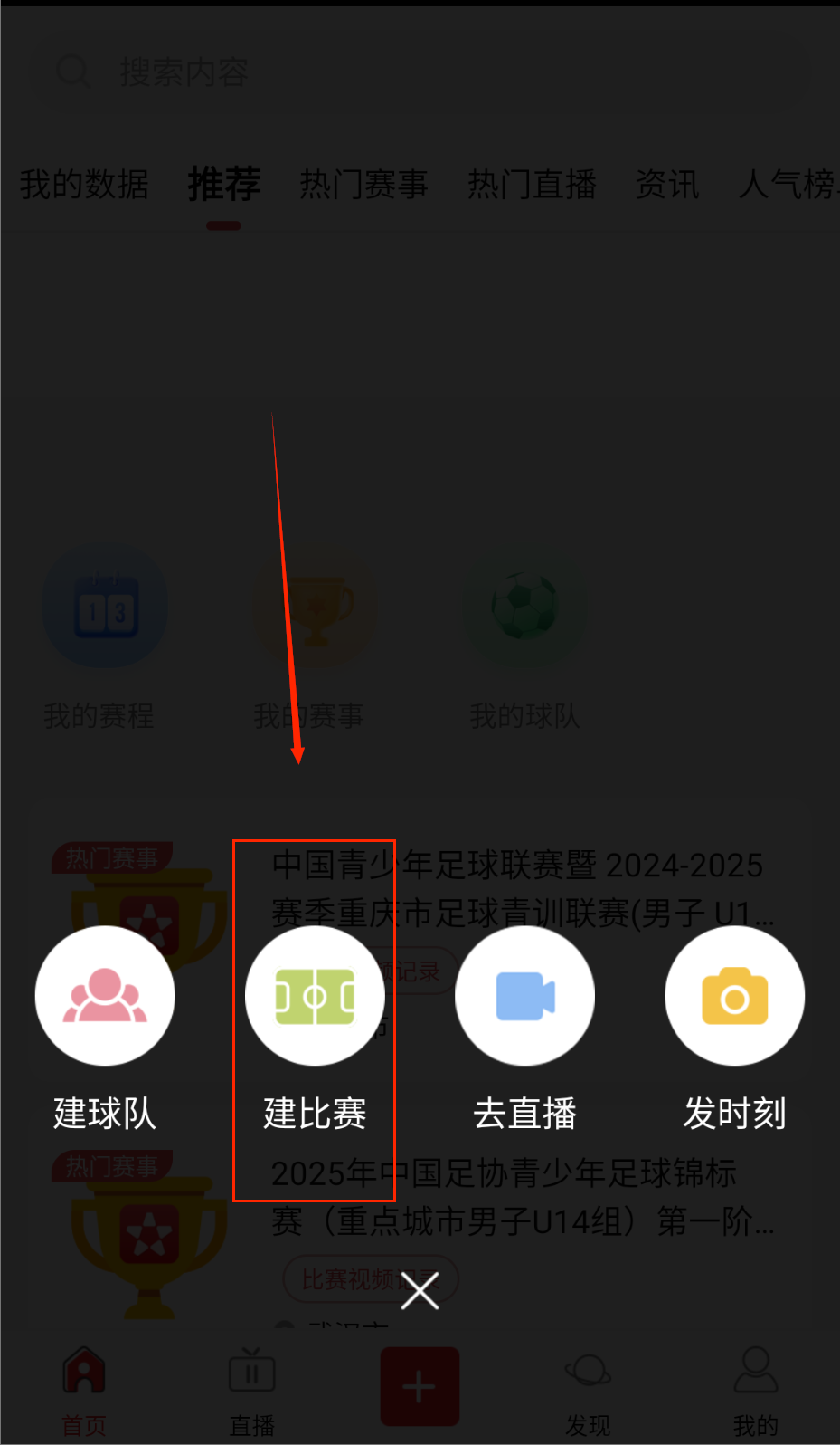 2、弹出一个选框,依次点击建比赛选项。