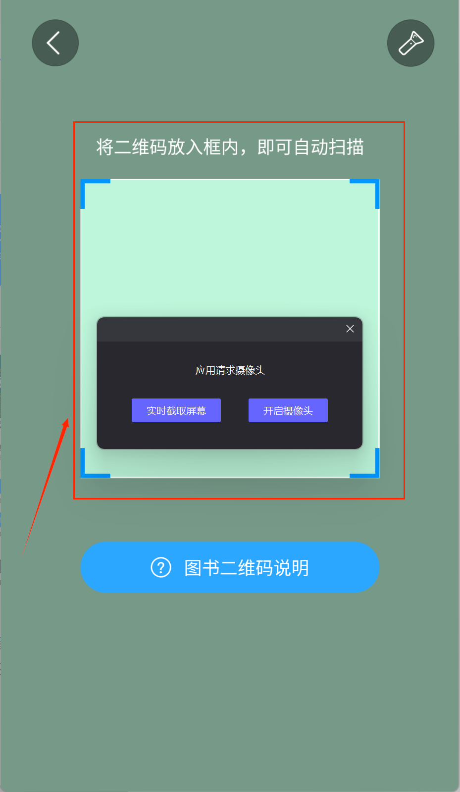 2、扫描图书时对准绿底界面的蓝色框,系统会自动识别二维码,记得允许摄像头权限才能正常使用呢。