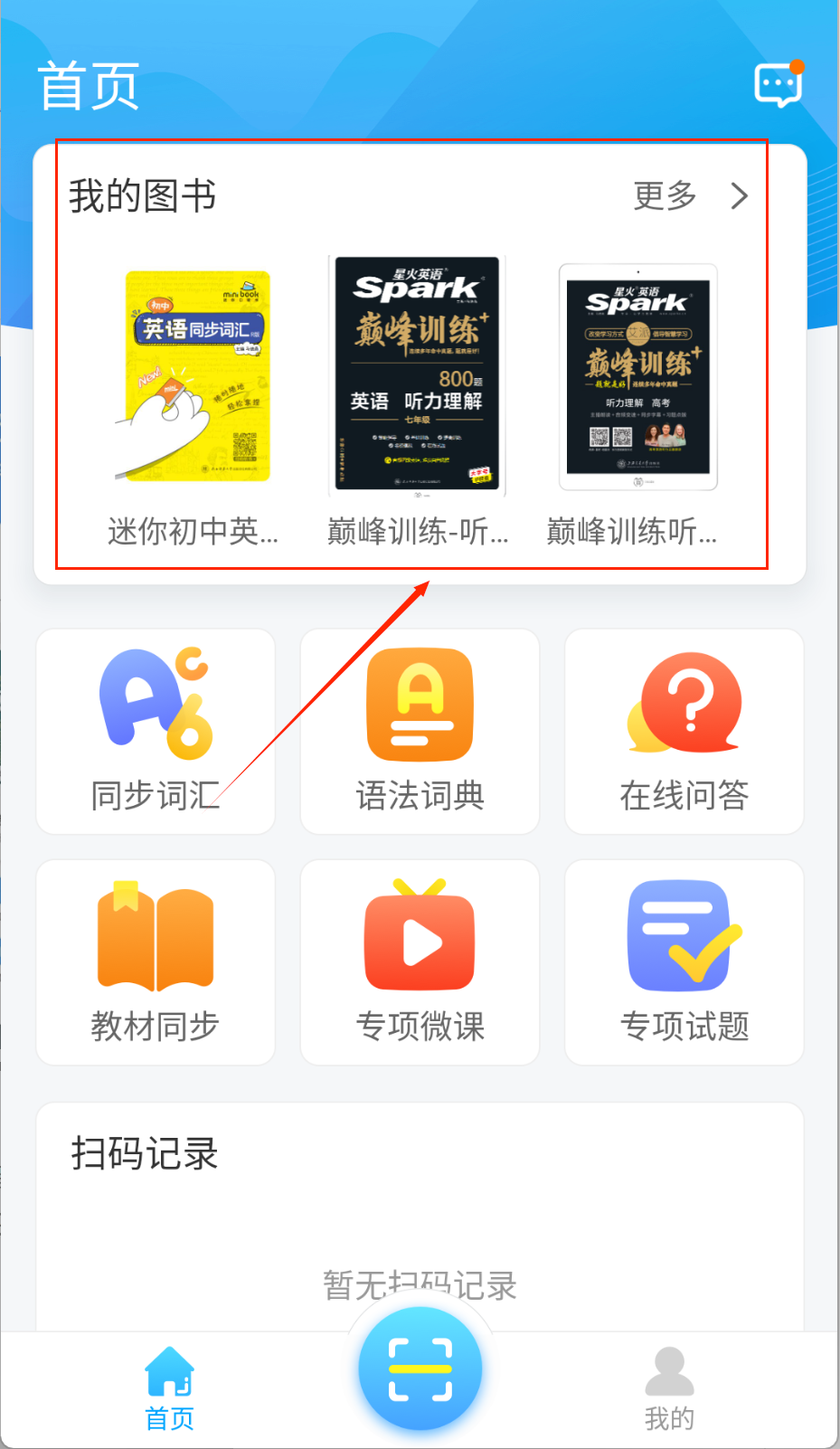 3、在首页右滑找到"我的图书"栏目,选择听力材料开始练习,配合专项微课巩固知识点,学习效果更好啦。