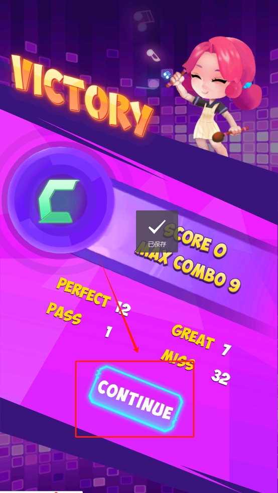 3、完成歌曲后点击“CONTINUE”按钮以查看得分并继续游戏。